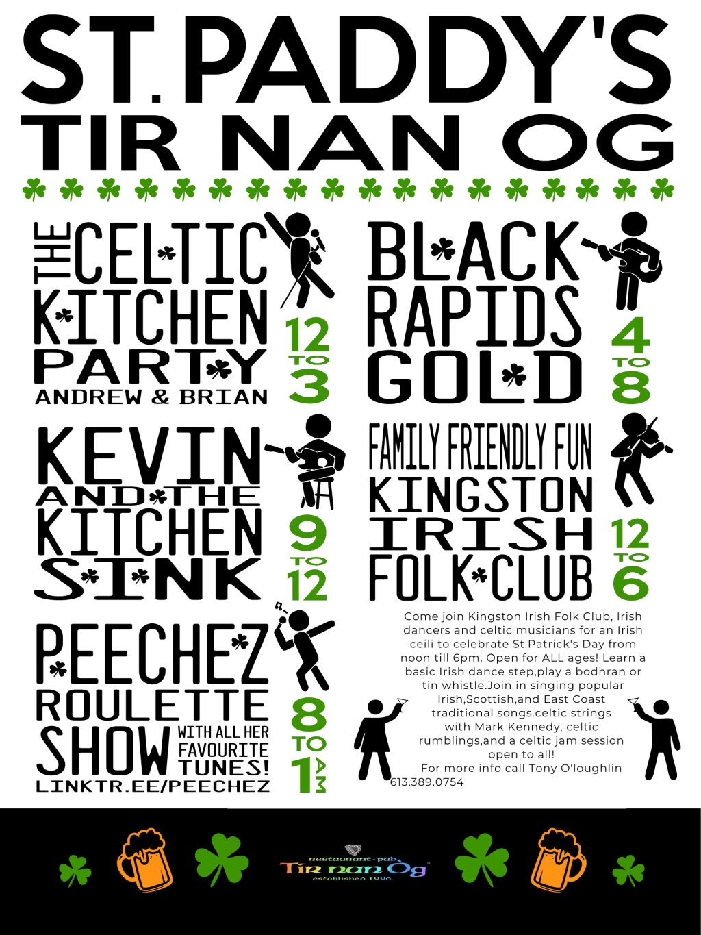 From 12:00 PM to 6:00 PM the Kingston Irish Folk Club along with Irish Dancers and Celtic Musicians for an Irish Ceili! The event is open to all ages, where kids can learn a basic Irish dance step, play a Bodhran or Tin Whistle. The entire family can also join in singing traditional Irish, Scottish and East Coast Songs! Learn and play Celtic Strings with Marc Kennedy – with Celtic rumblings and jam session for all! For more information, contact Tony O’Loughlin at 613-389-0754.