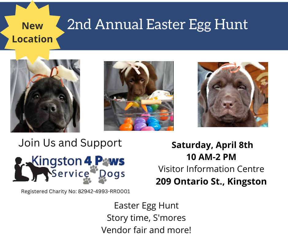On April 8th, join us at the Visitor Information Centre, 209 Ontario St, Kingston (Confederation Park, across from City Hall) for an Easter Egg Hunt in support of local charity Kingston 4 Paws Service Dogs. Not only is there an Easter Egg Hunt, there’s fun for the entire family from free coffee, hot chocolate, and s’mores, to a vendor fair, and lots of kids’ activities including colouring, story time with local author Peggy Collins, special guests and more!