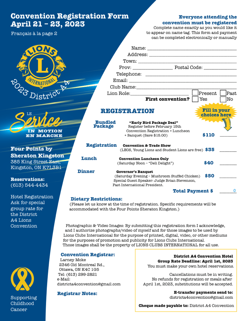 48th Annual District A4 Lions Convention running 21-23 April 2023 at the Four Points by Sheraton 285 King St. E. Kingston.