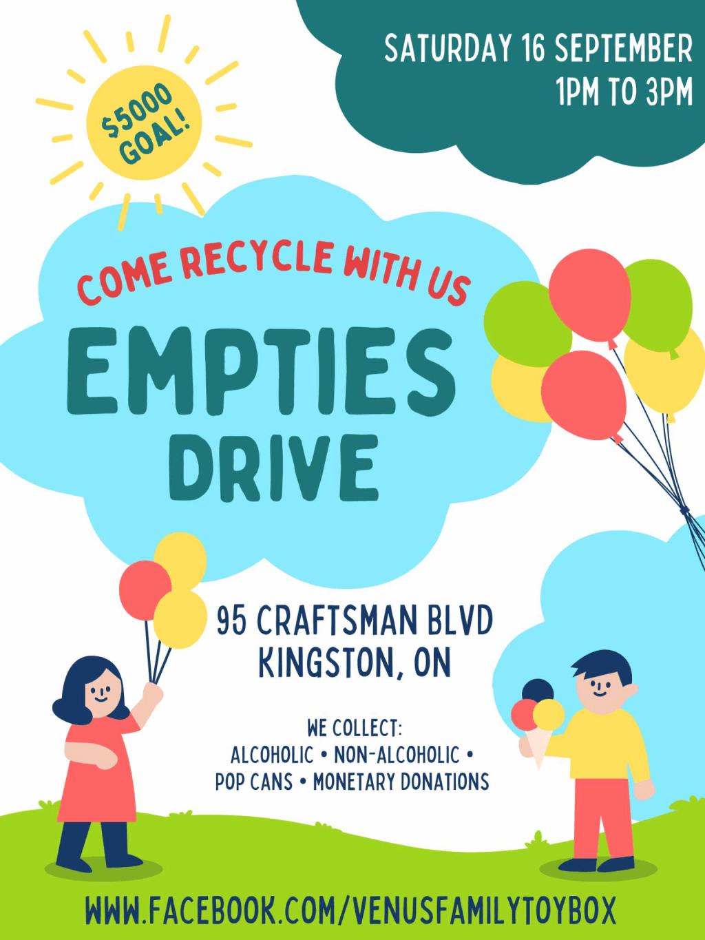 Venus Family Toy Box Empties Drive Where Kingston Map When Sep 16/23 01:00 PM - Sep 16/23 03:00 PM Age All Website https://www.facebook.com/venusfamilytoybox We need your help to bring your alcoholic and non-alcoholic empties plus any aluminum cans you may have!! We can’t wait to see you there and receive your help to achieve our goal in making a difference for a child on Christmas morning!!