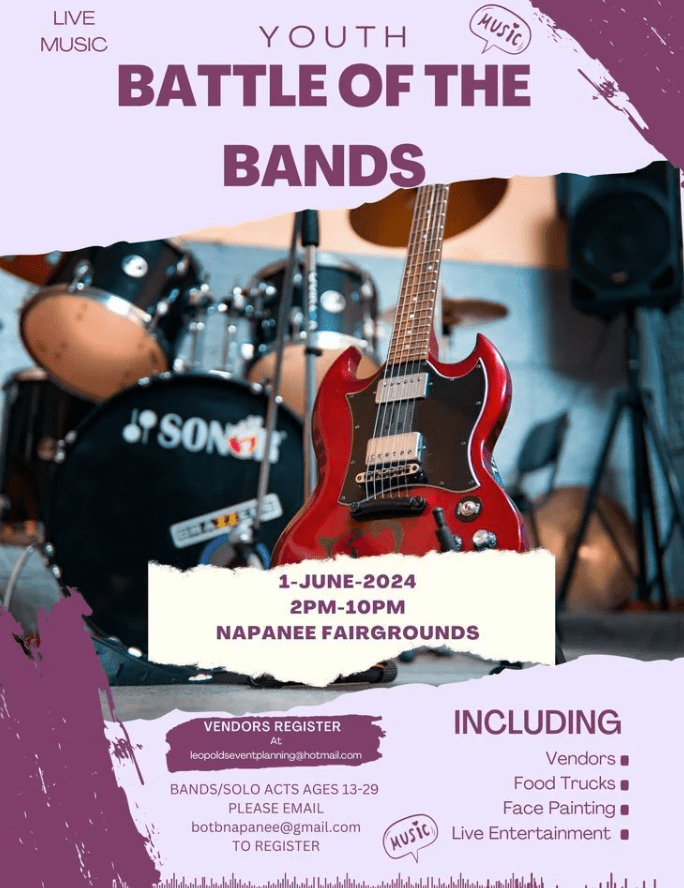 Come rock out with us well you shop tons of local businesses and Eat delicious food from one of the many food vendors!ENTRY FEE AT GATEAges 13+ 15$Ages 5-12 10$Ages 0-4 Free*ONLINE PRESALE PRICES*Ages 13+ 10$Ages 5-12 5$Family Pass 20$ (includes 2 adults and 2 kids under 18)Youth bands ages 13-29 please email us at botbnapanee@gmail.com for an application *APPLICATION DEADLINE MAY 1ST*Vendors please email us at leopoldseventplanning@hotmail.com for an application