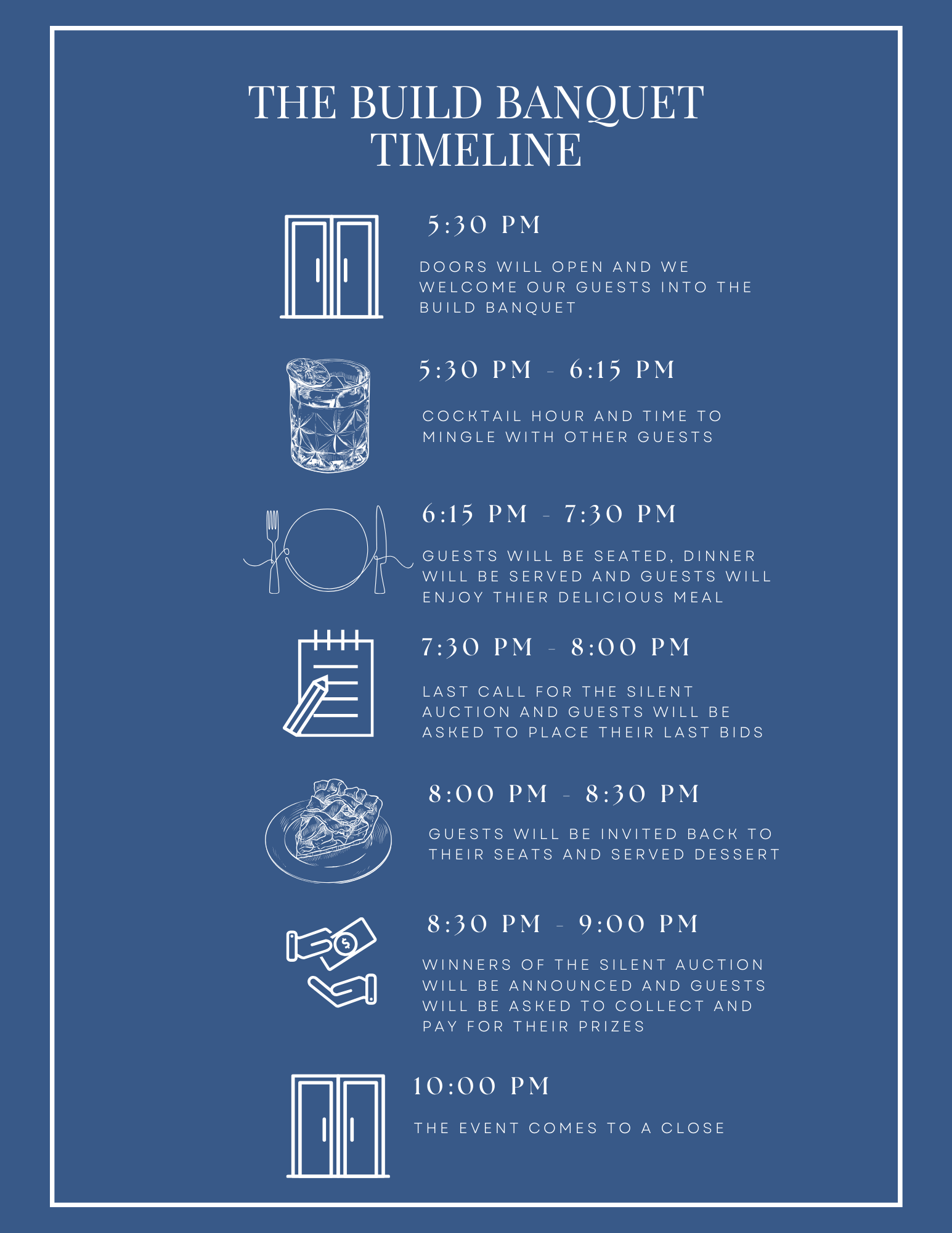 The event will start with a cocktail social hour along with appetizers, followed by a seated dinner. Post-dinner, guests will have the opportunity to place their final bests on silent auction items.