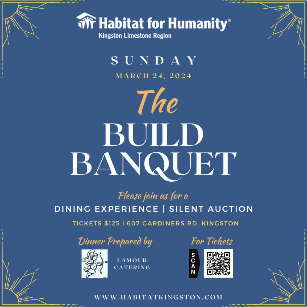 The Habitat for Humanity Kingston ReStore will be converted into an elegant dining atmosphere for The Build Banquet, an annual fundraiser. This is a casual dining fundraiser that will be catered by Lamour Catering. Proceeds from the event will go to Habitat for Humanity Kingston Limestone Region Building Program.